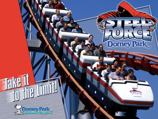 Steel Force en mega coster ifrån 1997. Bakom ser man den enda träbanan i parken,